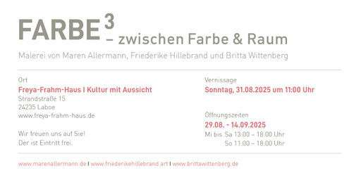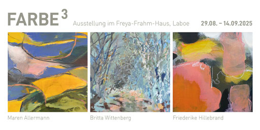 Die Kraft der Farbe und die Abstraktion der Form spiegelt sich in der eigenen Bildsprache der Künstlerinnen Maren Allermann, Friederike Hillebrand und Britta Wittenberg wieder und verbindet sie auch miteinander. In dieser Ausstellung sind "Farbspuren" gelegt worden, den die Besucher*innen beim Rundgang der Ausstellung im Freya-Frahm-Haus in Laboe entdecken können, um die Bilder mit ausdrucksstraken Farbräumen, Bewegung und Emotionen zum Thema Natur, Licht und Figur im Raum, die hier malerisch zu sehen sind, zu bewundern. Seien Sie herzlich willkommen!
